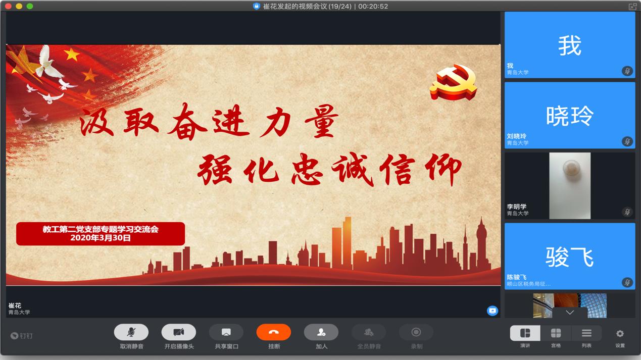 320日下午, A片无码 教工第二党支部利用钉钉视频会议召开了汲取奋进力量,强化忠诚信仰专题视频学习交流会。会议由教工第二党支部书记崔花主持, A片无码 党委书记王传永及二支部教师党员参加会议。与会党员认真开展了政治理论学习,并结合疫情期间网上授课的经验和体会,对“开展网络思政、强化爱国主义教育、强化对党、对国家的忠诚信仰”等方面内容进行了交流讨论。