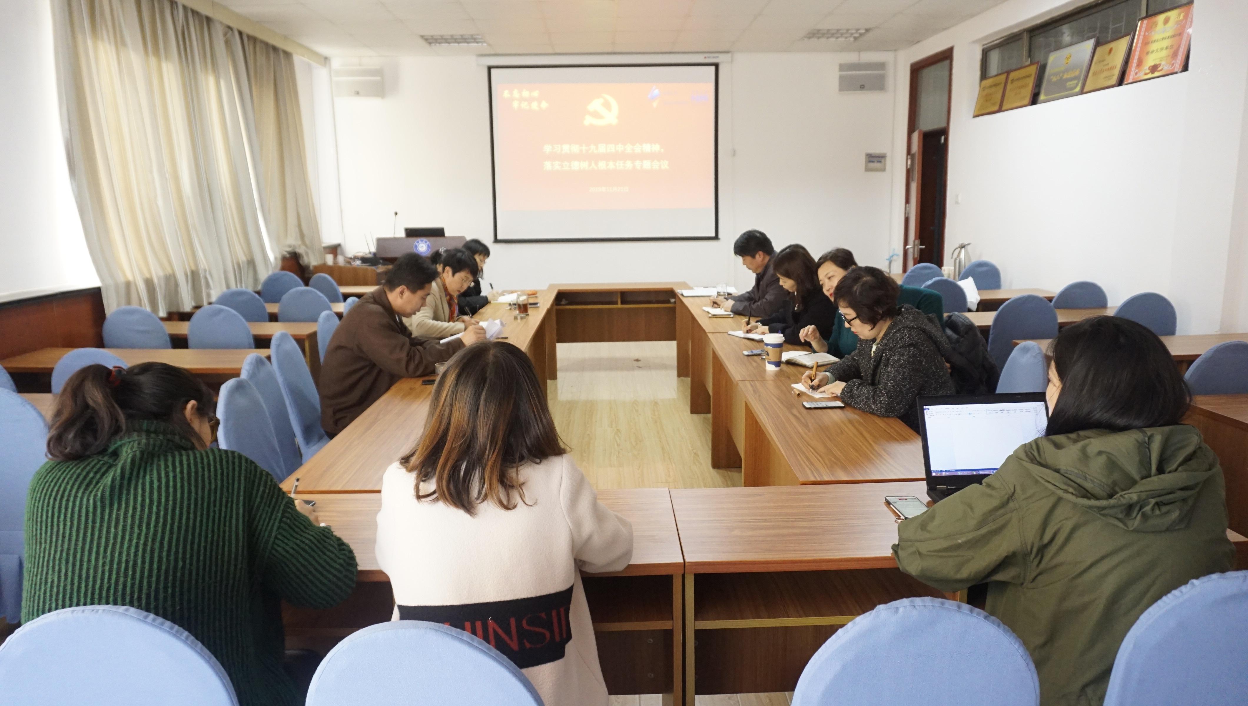 党委理论中心组围绕“学习贯彻十九届四中全会精神,落实立德树人根本任务”专题进行“不忘初心、牢记使命”主题教育第四次集中学习研讨。院党委书记王传永主持学习会。院党委领导班子、各支部书记、各办主任、全体辅导员参加了学习研讨。