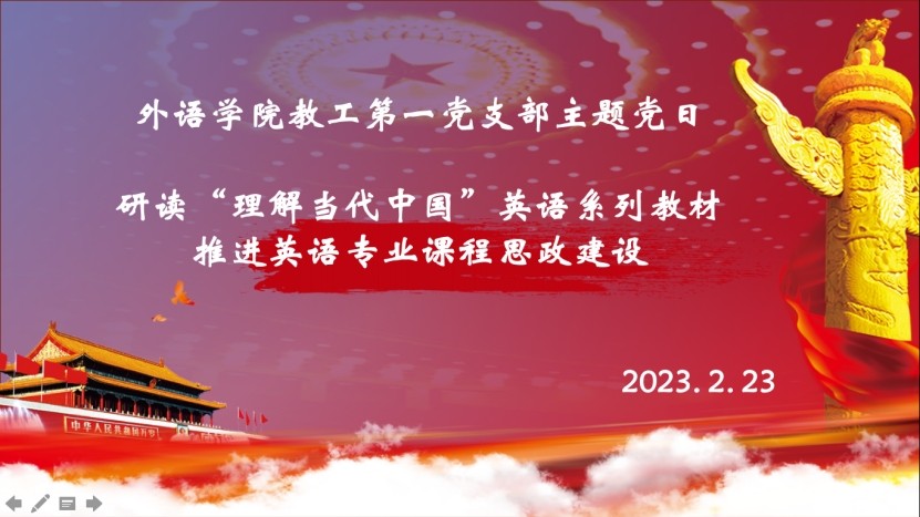 党委副书记、院长卞建华同志和英语系、英语教育系教工党员参加,对“理解当代中国”英语系列教材融入英语专业课堂教学进行交流研讨。