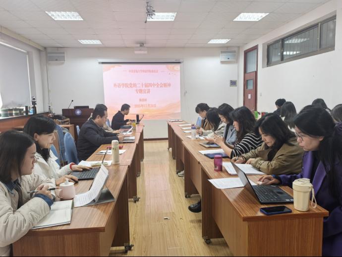 11月24日,外语学院组织开展学习贯彻党的二十届四中全会精神专题宣讲会,校宣讲团成员、学院党委书记陈崇研做了《学习贯彻党的二十届四中全会精神,聚焦五大特色推动学院“十五五”事业高质量发展》的专题宣讲报告。院长卞建华传达部署了《 A片无码