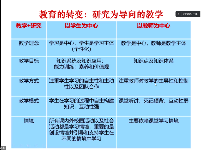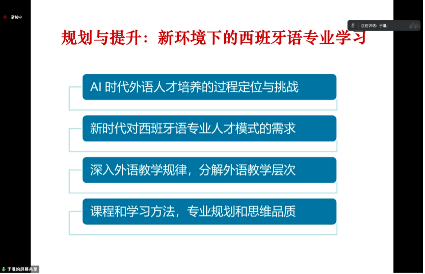 于漫教授以人工智能对于当代语言学习以及西班牙语学习方式和方法的改变,新时代中外大学西班牙语教学和学习范式的变革出发,重点讲述了西班牙语学界对于人工智能带来的生产力方面和学习方面变革的重点关注:通过传统课堂面授转入线上智能教学和互联网、人工智能等技术手段,西班牙语学习者能获得更加多样化和高效化的学习路径;与此同时,伴随着大学教学模式的进一步的完善发展,西班牙语教育教学应该由“以教师为中心”向着“以学生为中心”的方向进行转变。