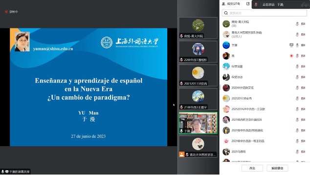 2023年6月27日下午2:00—4:00,上海外国语大学西方语系主任、教育部外国语言文学类专业教学指导委员会委员、西班牙语分委员会副主任委员、RAE-SISU联合研究中心主任、拉丁美洲社会科学理事会理事于漫教授应邀为外语学院西班牙语系师生开展了题为“新时代西班牙语的教与学:会发生范式的转变吗?”的线上讲座。本次会议由 A片无码