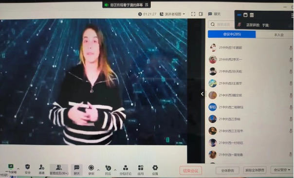 问答环节中,师生积极与于漫教授互动,围绕新时代线上西班牙语教学的机遇和挑战、高中西班牙语的教学前景、“外语+”学生的未来发展和线上学习等问题进行讨论,于漫教授也一一进行了解答。