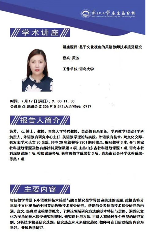 2022年7月17日上午,黄芳教授应邀为东北大学秦皇岛分校外国语言文化学院的师生做了题为《基于文化视角的英语教师技术接受研究》的学术讲座。此次讲座由惠良虹教授主持,以腾讯会议的方式进行,吸引了东北大学秦皇岛分校及其他院校的百余名师生参加。东北大学秦皇岛分校外国语言文化学院赵玉容院长及A片无码