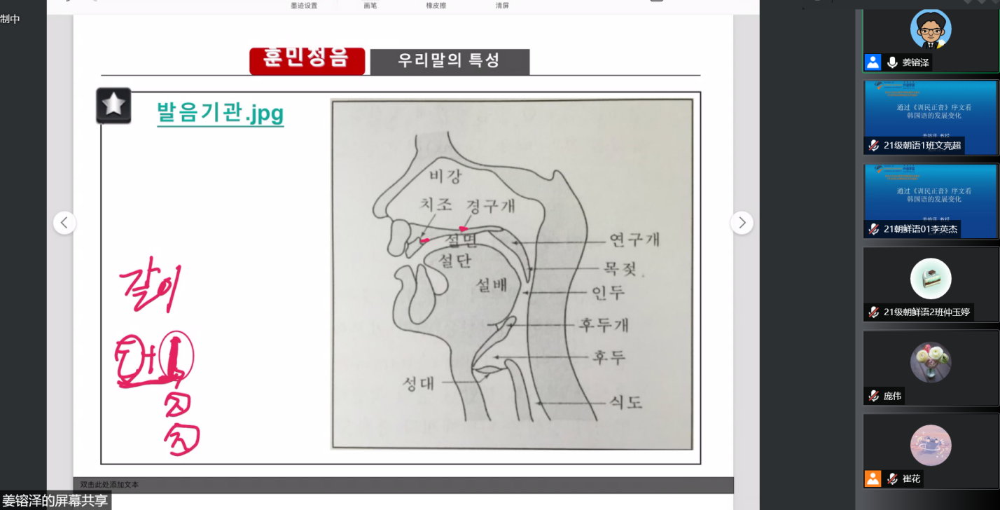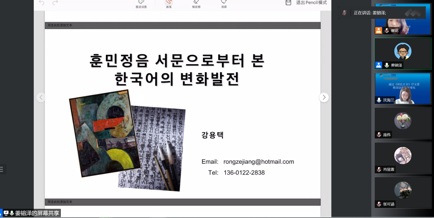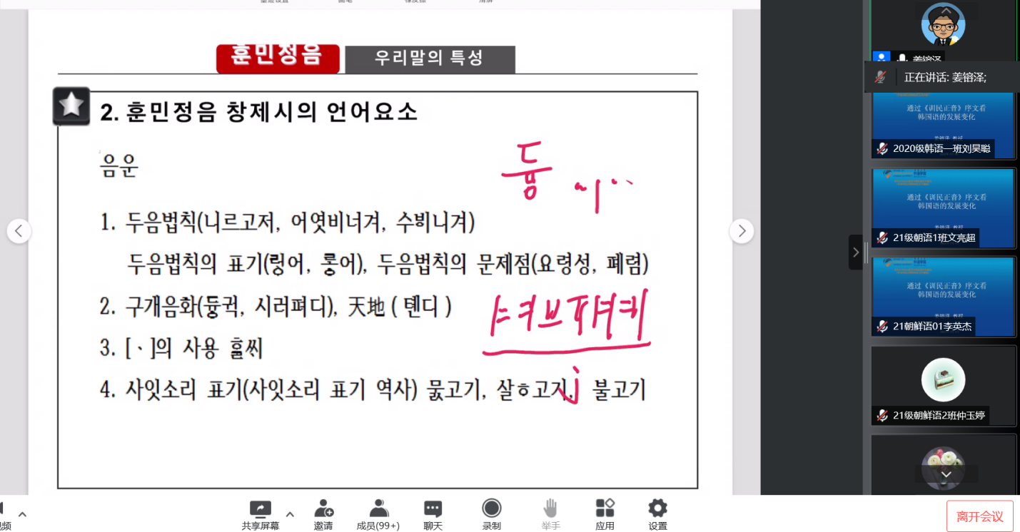 朝鲜语系师生带来了题为“通过《训民正音》序文看韩国语的发展变化”的精彩学术讲座。此次讲座由朝鲜语系主任崔花老师主持,朝鲜语系多位老师以及全院学生通过腾讯会议参与了本次讲座。