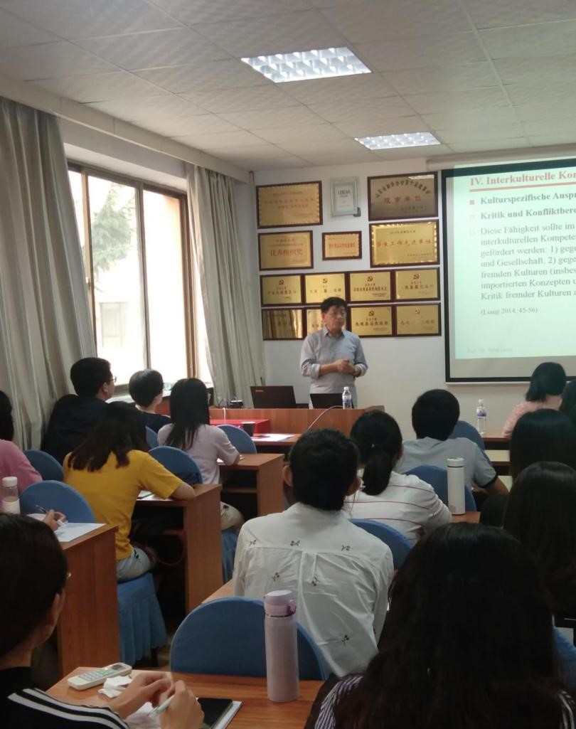 9月17号下午德国特里尔大学前汉学系主任梁镛教授在博文楼312为外院师生带来了题为《文化认同与跨文化能力培养》的专题讲座。