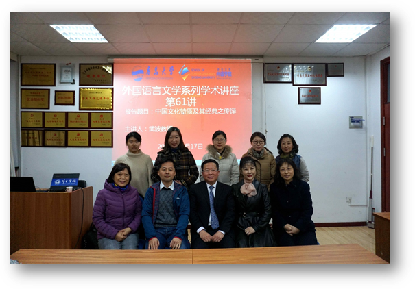 举行外国语言文学系列学术讲座第61讲。外交学院英语系教授武波,应邀为外院师生做了“中国文化特质及其经典之传译”的专题学术讲座。院长助理布占廷主持讲座,学院部分老师及研究生参加此次讲座。