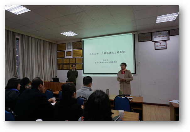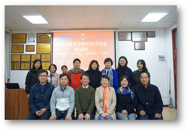 在博文楼312会议室举行“外国语言文学系列学术讲座”第58讲。翻译理论及文化研究著名台湾学者张上冠教授应邀作“三生三世:《桃花源记》之英译”的专题学术讲座。院长卞建华主持讲座,学院部分老师及研究生参加此次讲座。