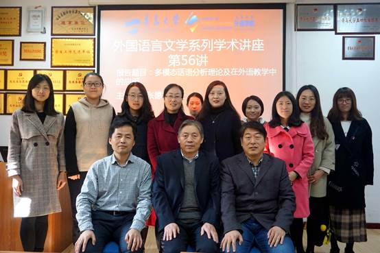 于博文楼312会议室举行“外国语言文学系列学术讲座”第56讲。同济大学特聘教授、博士生导师张德禄应邀为外院师生做了“多模态话语分析理论及在外语教学中的应用”的专题学术讲座。院长助理布占廷主持,学院部分老师及研究生参加了此次讲座。