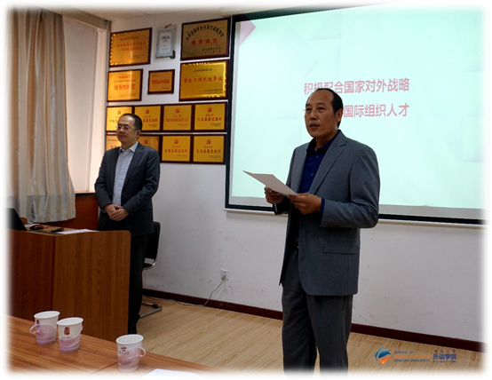 邀请,做客外国语言文学系列学术讲座第51讲,在博文楼312会议室作题为“积极配合国家对外战略,大力培养国际组织人才”的学术讲座。讲座由德语系系主任綦甲福教授主持,学院60余名师生聆听了讲座。