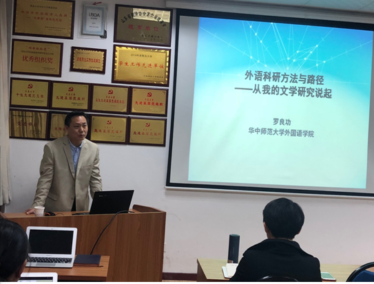 讲座中,罗良功教授以其本人的学术经验为例,分别从教学与科研、研究领域的聚焦与拓展、专家意识和体系建构、理论与创新等四个方面,阐释外语学科科研方法的动力、方法和路径。