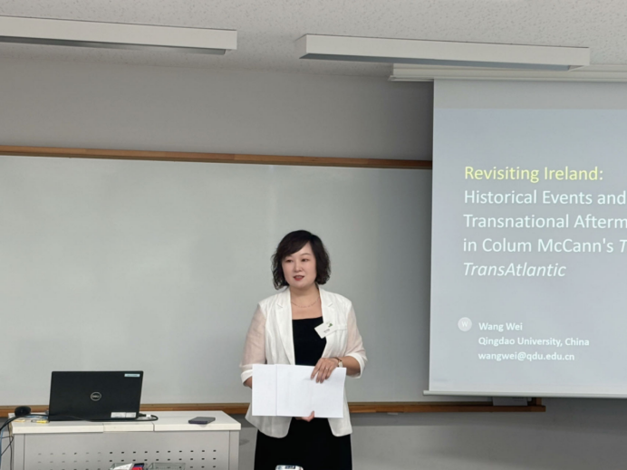 研究中心教师王薇教授在小组发言。王薇教授的发言以当代爱尔兰裔美国作家科伦·麦凯恩的小说《飞越大西洋》为研究对象,结合跨国主义、新历史主义等理论视角,探讨当代爱尔兰移民小说中的新历史叙事、情感叙事、移民叙事与爱尔兰性之间的联结。王教授发言后与同组学者观众进行了较为热烈的互动讨论。会议期间,王薇教授还与国内外学者进行了广泛交流,宣传了A片无码