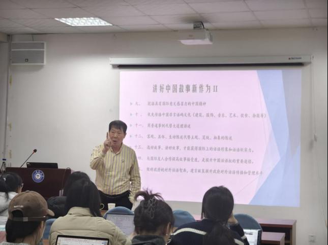 讲座伊始,谢旭升教授从霍尔姆斯对翻译学科的经典划分切入,并结合自己长期从事跨文化交流、媒体翻译与政治话语传播的研究实践,指出翻译研究由“译学理论”与“译术应用”共同构成,译学统摄译术而译术践行译学。在讲述过程中,谢教授多次结合自身亲历的翻译案例,语言诙谐、生动,现场不时响起笑声,使严肃的理论问题变得直观、鲜活。他围绕“讲好中国故事”这一核心主题展开,梳理了其PPT中从“讲好中国故事的背景、意义、战略布局、中央重要指示与专家论见,到世界话语体系中的中国故事内涵”等多个板块的内容,系统呈现了构建中国国际传播话语体系的重要路径。他强调,翻译传播中应坚持“求大同,存小异”,以“归化为主、异化为辅”的策略来实现有效的跨文化沟通,惟其如此,才能真正达到“润物细无声”的传播效果。