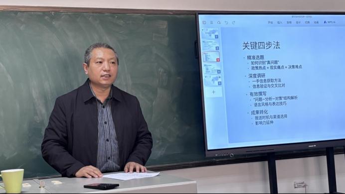 魏建平教授结合自身丰富的智库研究与政策建言经验展开讲解。他首先从“破题——什么是好的智库报告”入手,强调智库报告的本质是“决策者的行动参考书”,其核心使命在于服务决策、影响政策、推动改变。他指出,智库思维与学术思维存在显著区别:学术研究追求“为什么”,“挖深井”,追求深度,而智库报告追求“怎么办”,是“架桥梁”,追求实效。魏教授系统阐述了撰写高质量智库报告的“关键四步法”:一是精准选题,需紧密结合政策热点、现实痛点与决策难点;二是深度调研,强调一手信息获取与交叉验证的重要性;三是有效撰写,推荐采用“问题—分析—对策”等结构,语言风格应简明扼要,善用数据与案例支撑;四是成果转化,注重报送时机与渠道选择。概而言之,一份好的智库报告应具备“三有”:有靶心、有实策、有回响。
