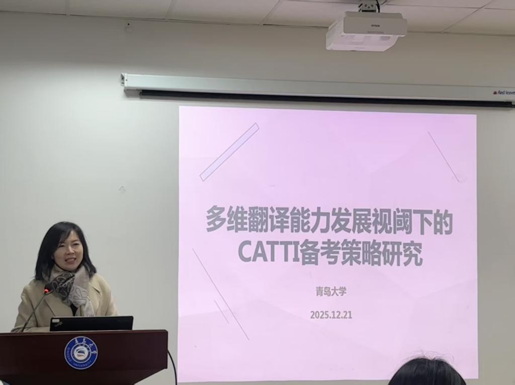 翻译硕士研究生校外导师。12月21日上午,赵老师以“多维翻译能力发展视阈下的CATTI备考策略研究”为主题,分享了CATTI备考的各种“干货”。从前期备考、中期训练到实战作答各个环节,进行了全面的技巧分析,同时在讲座中带领同学们进行翻译案例练习,极大地带动了大家的学习热情。赵老师总结了考试常见失分点和扣分项,并针对笔译和口译专业分别进行核心考点剖析,方便同学们更高效地进行备考,提升翻译技巧。