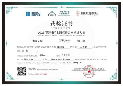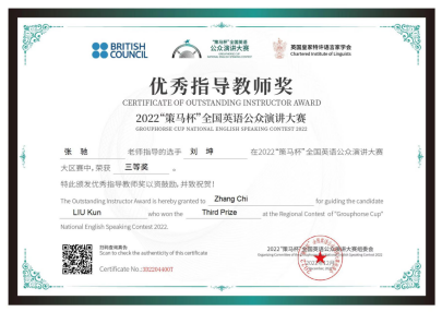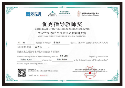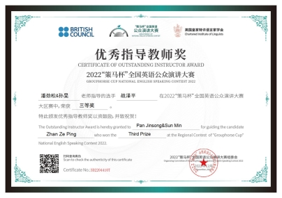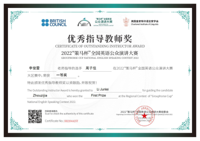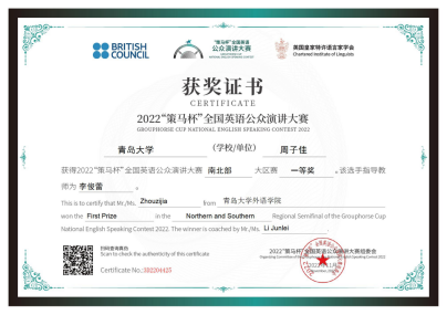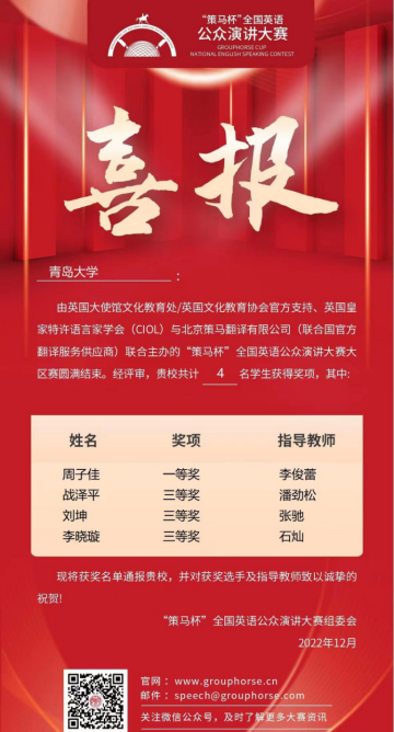 四位同学在老师们的指导下荣获佳绩。其中,2021级英语系语言大数据创新实验班周子佳同学成功晋级2023年全国总决赛。
