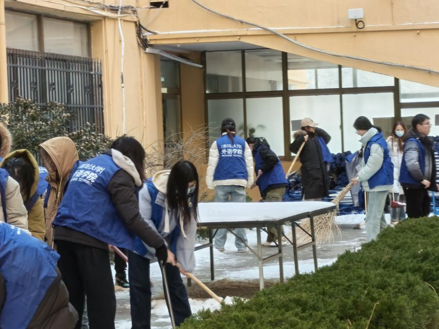 党委副书记王海青、辅导员张淑敏、刘浩带队,学院党员及学生志愿者积极响应。大家不畏严寒,团结合作,纷纷拿起铁锹、扫帚等工具,投入到清扫雪地的行动中。在全体师生的共同努力下,博文楼周边及楼中厅道路的积雪清扫干净,道路畅通无阻。