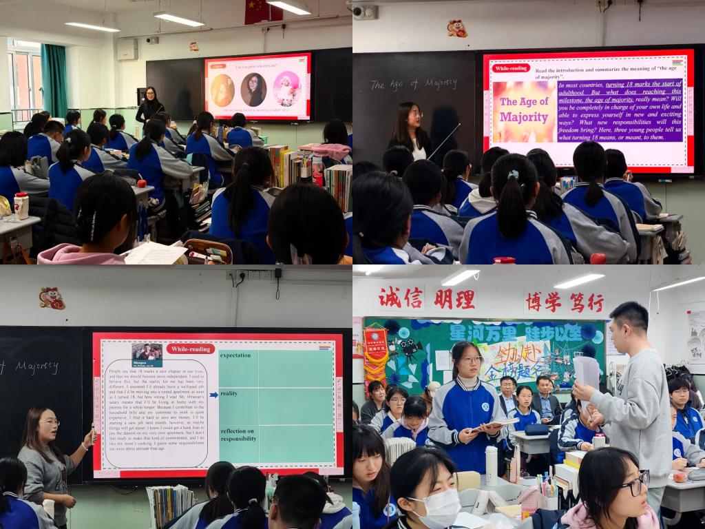 赵虹、陈亦菲、罗甫梅、马优四位研究生同学在高二•四班开展了课堂教学实践展示。同学们以“The Age of Majority”为题,展示了扎实的学科功底与灵活应变的能力。课后的集体教研环节,由梁永召老师主持,四位同学开展了课堂反思与感悟。高晓亮副校长、布占廷副院长、任爽老师进行了指导与点评。