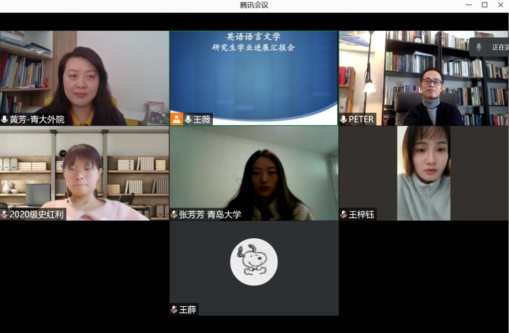 英语语言文学学科采用线上、线下相结合的方式,举办研究生学业进展汇报交流会。线下师生齐聚博文楼312会议室,线上师生则利用腾讯会议相聚云端。本次汇报交流会由英语语言文学学科负责人王薇老师主持,冯冬副教授、孟宪华副教授、黄芳教授及本学科三个年级研究生参加。