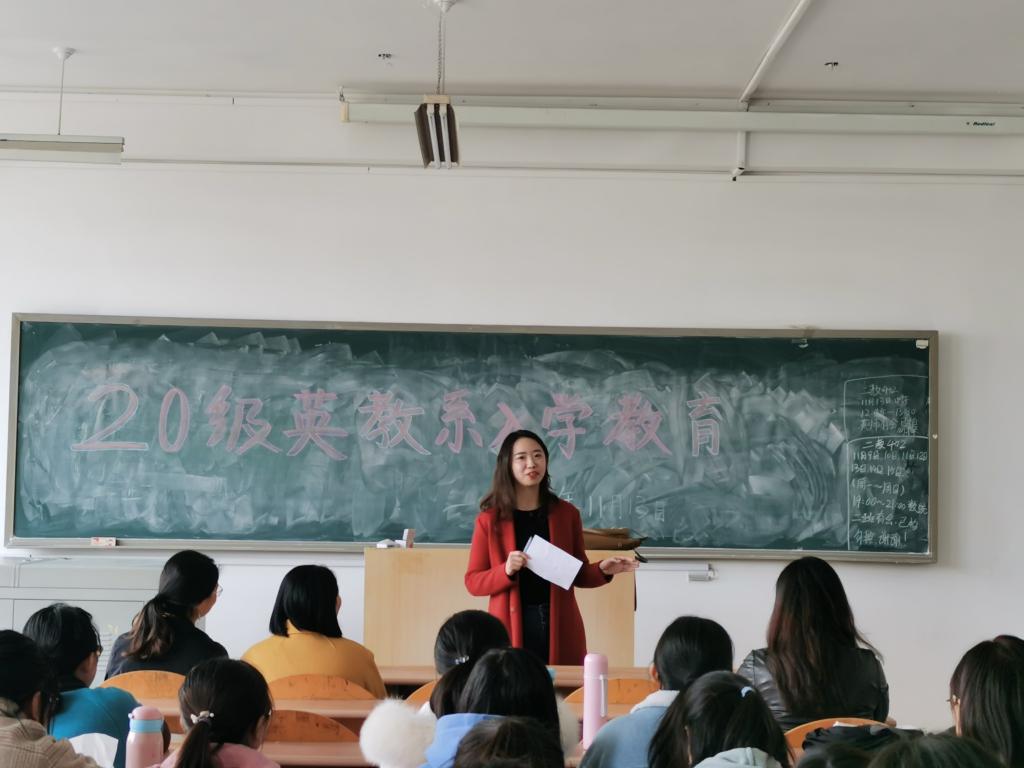 黄芳主任介绍了目前国家对师范生教育的重视和举措,结合英语教育系悠久的办学历史和过硬的师资力量,对20级英语师范新生提出了具体的学习要求;分析了考研及制定长远目标的必要性。她指出,师范生必须努力提高自身的英语语言技能、教学技能、沟通及思辨技能,为我国义务教育阶段的英语人才培养贡献自己的力量。另外,目前师范生考研的政策明朗,同学们应明确职业发展方向,从大一开始练就扎实的基本功,大三大四从容地应对考研、师范生技能大赛等各项挑战。