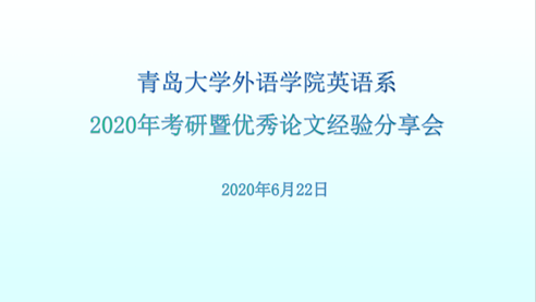 英语系于6月22日晚,在腾讯会议举行了2020年考研暨优秀毕业论文经验分享会。会上,杜琳、刘榛、常晨、王语涵、李宇涵等代表2020年英语系55位考研成功的同学,王梓钰、王鑫、周沫等代表今年荣获英语系优秀毕业论文奖的同学,向大家分享了自己考研的宝贵经验和毕业论文撰写的心得体会。英语系大二、大三同学和部分老师参加了会议,会议由英语系王薇副主任主持。
