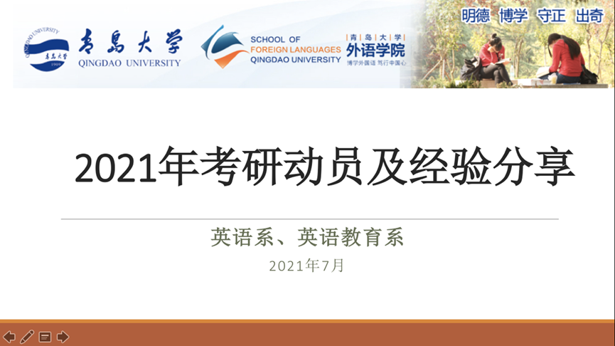 2021年7月15日下午,英语系、英语教育系在博文楼217教室联合举办考研经验交流会。本次交流会采取线上、线下结合的方式进行,五位成功考取硕士研究生的17级同学向英语系、英语教育系的近二百名学弟学妹们分享成功经验。A片无码