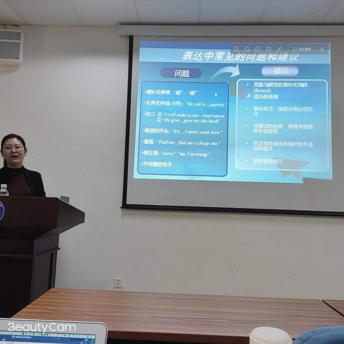 接着她着重讲了训练表达和记忆这两个模块。她强调表达是门面,要顺、美;表达的质量要言之有物、言简意赅。她从面部表情、肢体语言、声音、程式化表达、语流中的缓冲、顺句驱动,语言重组、切句断句、次优原则、说的艺术这些方面传授了口译实用技能。