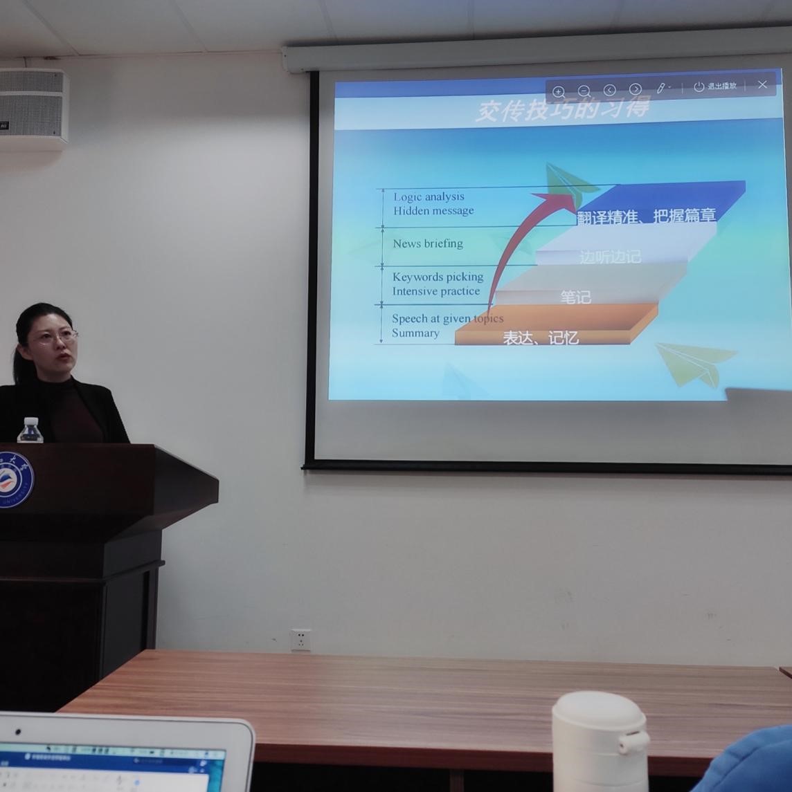 丛媛老师首先讲了口译工作者的必经之路,入门、强化和翻译精准的过程。她强调译者要能承受压力,要能吃苦,并根据自身经验传授了交传技巧,鼓励同学们用《经济学人》做翻译练习,平时注意积累地道表达,多记笔记;还要培养、锻炼概括能力,记忆能力;要多练习,熟能生巧。