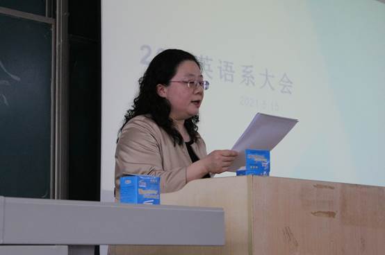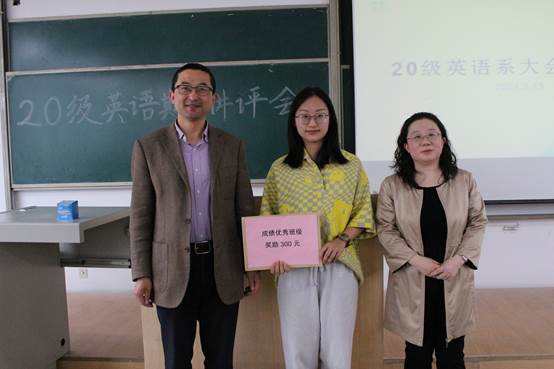 英语系在金家岭校区西院二教209教室召开2020级期中教学讲评会暨配音大赛表彰会。英语系主任邢富坤、副主任吕云、第一教研室刘晓燕和张驰老师、2017级孙铭辰和2018级马滢同学以及2020级全体同学参会,会议由吕云副主任主持。