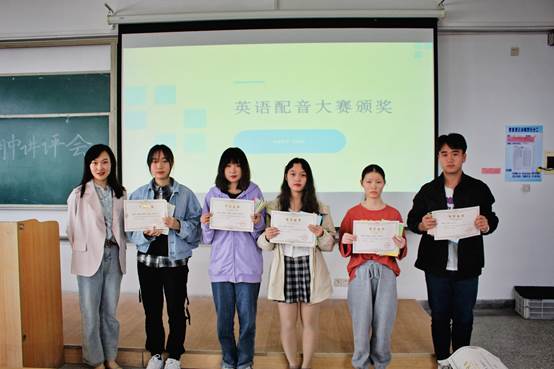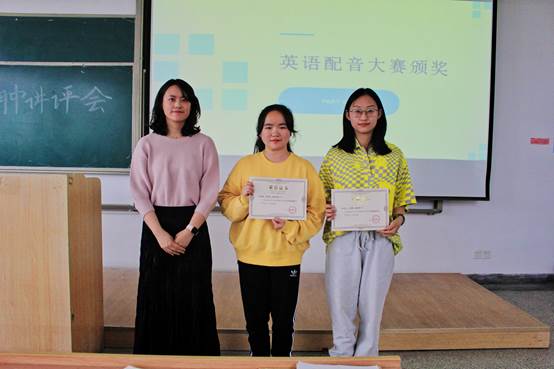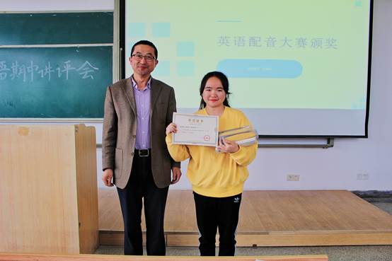 其后,张驰老师代表英语系第一教研室宣布了2020级英语配音大赛的奖项与名次,并颁发奖状和奖品。本学期初举办的2020级英语配音大赛设初赛和决赛两个环节。初赛20级所有同学94人组成24组参加,经过评审,共有9个参赛小组进入决赛。最终评出一等奖1组,二等奖3组,三等奖5组以及最佳语音奖和最佳配合奖两个单项奖。