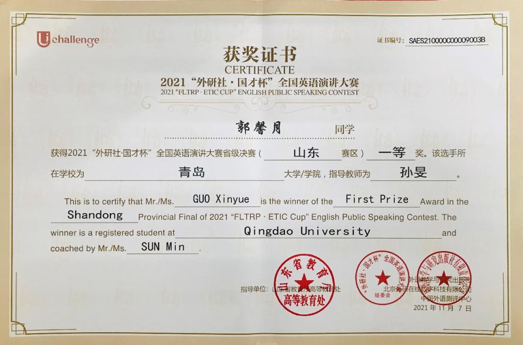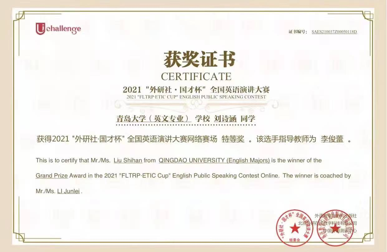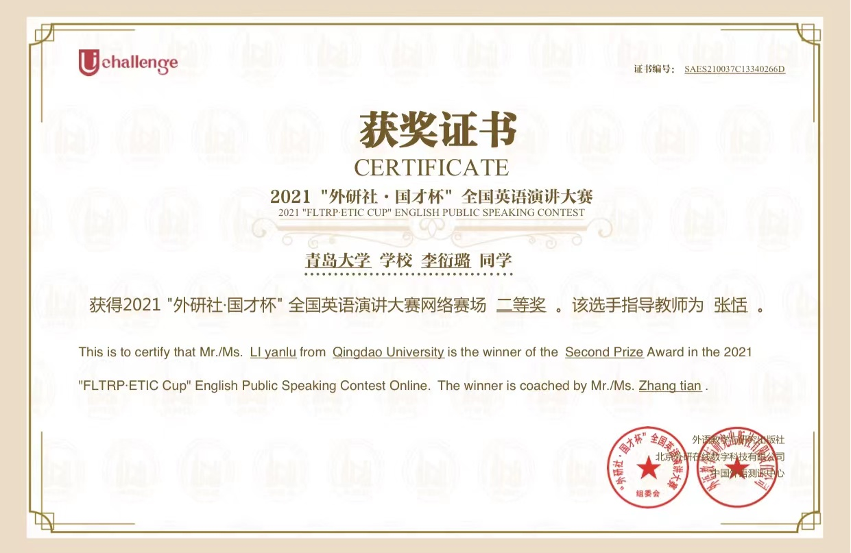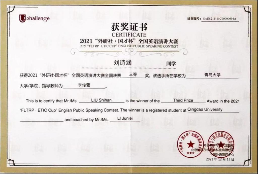 英语专业4名同学在“外研社·国才杯”全国大学生英语演讲大赛全国决赛中表现突出,成绩优异。2021级语言创新班刘诗涵同学荣获全国三等奖、网络赛场特等奖(指导教师 李俊蕾),2019级语言创新班郭馨月同学荣获省赛一等奖、全国网络赛场二等奖(指导教师 孙旻),2021级英俄创新班李衍璐同学(指导教师 张恬)和2021级语言创新班周子佳同学(指导教师 李俊蕾)分别荣获全国网络赛场二等奖。