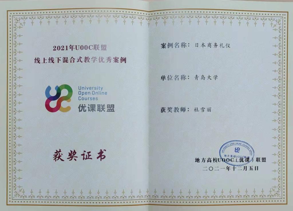 日语系杜雪丽老师主讲的线上课程“日本商务礼仪”,被评为线上线下混合式教学优秀案例。