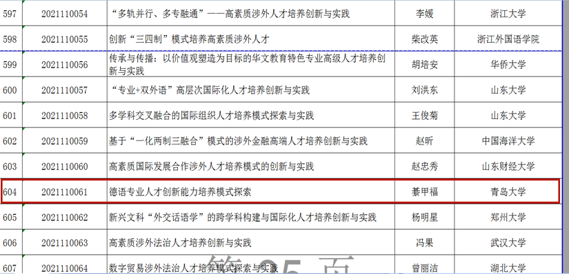 创新人才培养目标,依托鲁巴教育合作项目、欧盟Erasmus+项目及双学位联合培养项目,以《普通高等学校本科专业类教学质量国家标准(外国语言文学类)》和《普通高等学校本科外国语言文学类专业教学指南》为依据,修订德语专业人才培养方案,优化德语专业课程体系,突出学术思维训练和产出导向,强化价值引领,丰富形式载体,创新方法手段,形成了构建德语专业创新能力培养体系的系列举措。此次获批立项,将有力推动该专业在新时代、新格局下的创新发展。