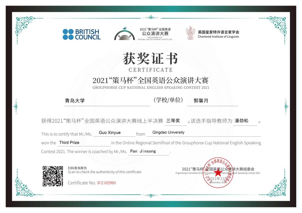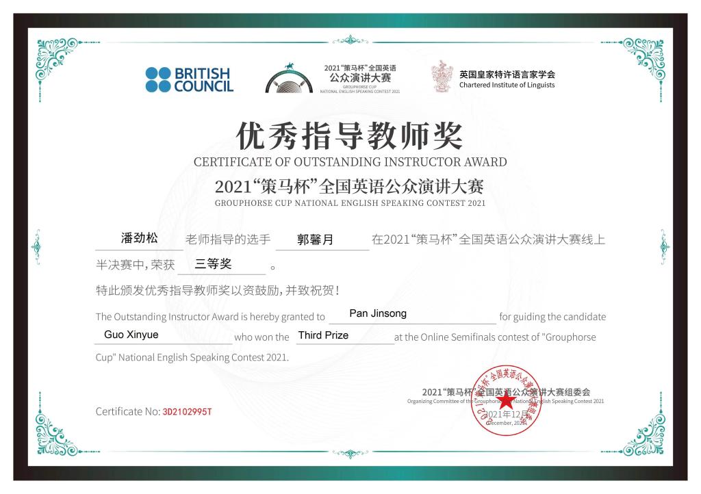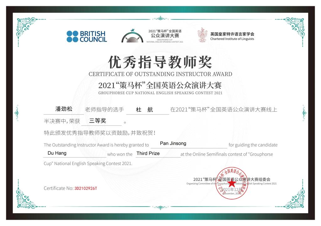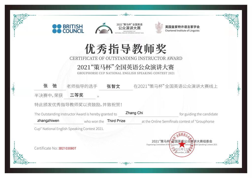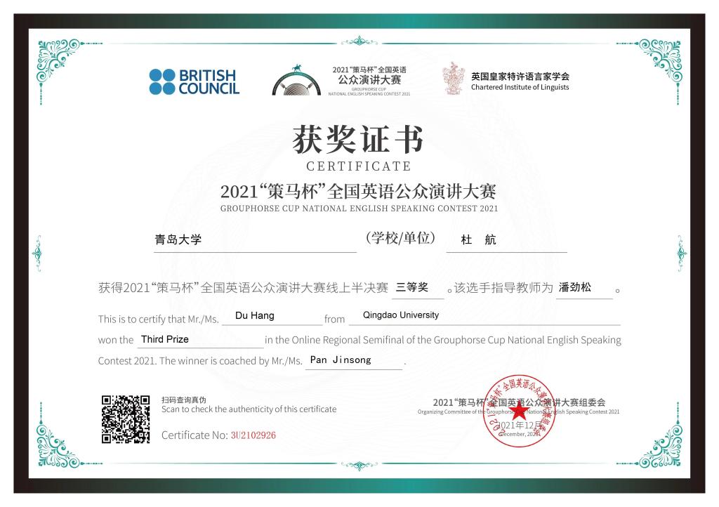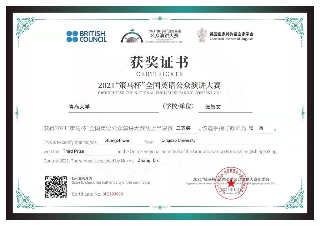 英语系张智文、杜航和郭馨月三名同学分别通过线上和线下两个赛道,经过初赛、复赛、大区赛、大区复赛和半决赛的层层闯关,从全国几千名选手中脱颖而出,获得三等奖(全国排名前25)的优异成绩。英语系的潘劲松和张驰两位老师获得优秀指导教师奖。