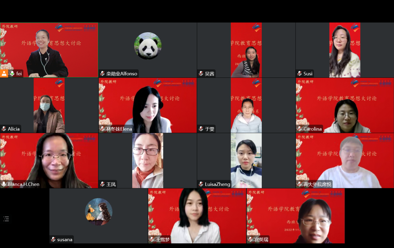 事业发展规划(2021-2015)》及西班牙语系现阶段发展方向。之后,陈皓主任介绍了西班牙语系目前正在推进合作的国外大学,古巴哈瓦那大学、西班牙马德里康普顿斯大学、巴拿马大学。王斐老师建议探索西班牙语师范专业的可能性。刘景芳老师认为应深入探究学生缺乏主动性的原因,与学工团队进一步合作交流。王雪梦、郑海瑶讨论了如何通过学院、学校、国家政策帮助自身提升学历,提高科研能力。经过热烈讨论,西语系明确了未来发展方向及确立了具体举措。宫院长对西语系的讨论给予了肯定。