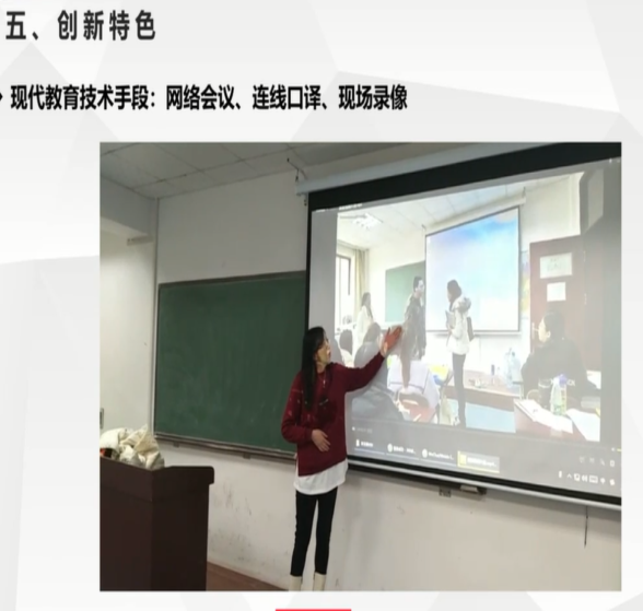 “跨文化口译实践II”是德语专业高年级主干课程之一,主讲教师为刘沁卉。该课程面向本科三年级下学期的同学开设,旨在提升学生跨文化能力,同步推进口译各项子能力发展,有效提高学生中德口译水平。口译工作不仅仅是双语转换,沟通协调能力、跨文化思辨能力等同样非常重要。因此,德语专业在2017版人才培养方案中,将原“德语口译”课程调整为“跨文化口译实践”,同时围绕如何解决传统口译课的课堂效率、学习体验等问题展开相关教改教研。经过长达 6 年的探索和实践,课程形成了“跨文化培养”和“沉浸式体验”这两大鲜明特色,课程设计与实施贯穿“以学为中心”理念,其翻转课堂的运用、“双师课堂”和“三个对应”等做法赢得了学生的认可和专家的肯定。