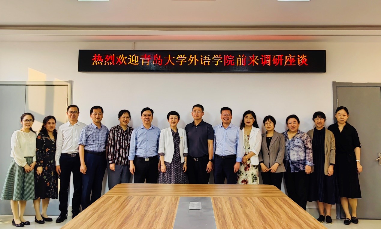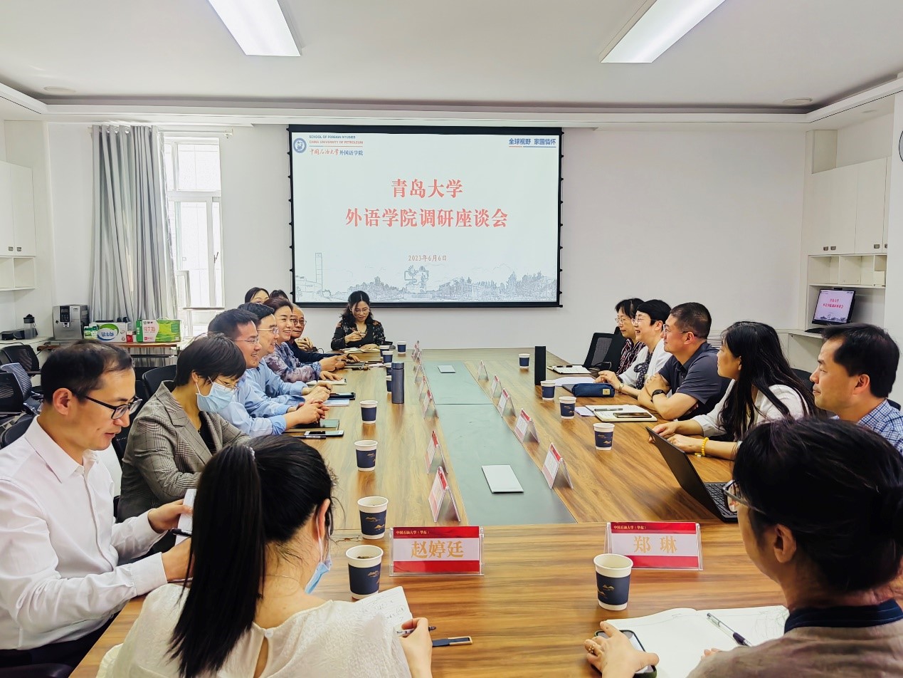 一行五人赴中国石油大学(华东)外国语学院调研,参加调研的有卞建华院长、周伟书记、王海青副书记、宫英瑞副院长和布占廷副院长。中国石油大学(华东)外国语学院毛浩然院长、朱惠平书记、邹维忠副书记、孙大满副院长、郭月琴副院长、张建科副院长等参加调研座谈。