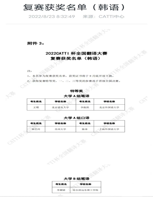 近日,2022年“CATTI杯”全国翻译大赛(复试)结果揭晓,我系2018级学生方仙花在比赛中喜获佳绩,荣获大学A组笔译二等奖。