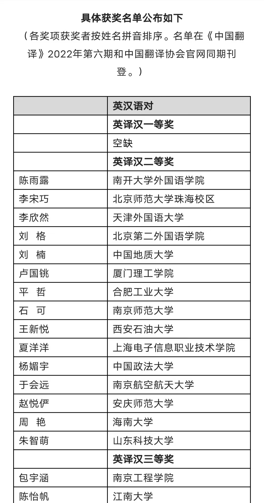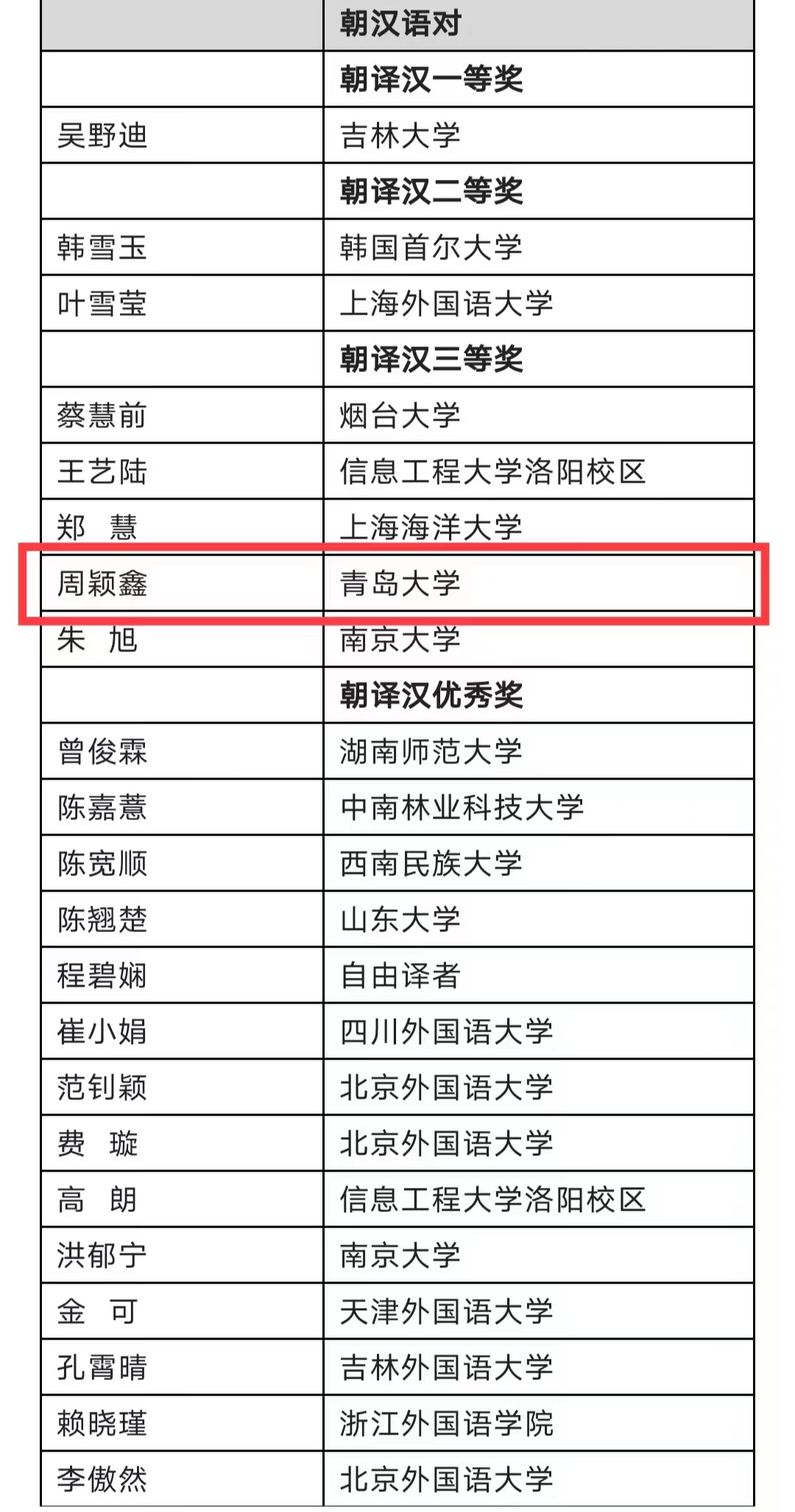 近日,第三十四届韩素音国际翻译大赛结果揭晓,我系2021级朝鲜语笔译专业周颖鑫在比赛中喜获佳绩,荣获朝译汉组三等奖。