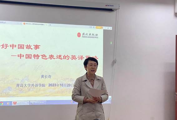 黄长奇教授强调,译好中国故事是我国国际传播能力建设的关键环节之一。黄教授结合自身多年的实践经验,详细介绍了翻译出版流程中的环节;接下来,黄教授结合具体案例,为大家解读了时政话语翻译的基本要求,即“读懂:学深悟透”“译准:准确达意”“有效:有效传播”“传神:再现文采”。最后,黄教授结合诸多翻译实例解读了中国特色表述的英译策略,指出在准确理解原文意义的前提下,我们可以采取音译、直译、意译及直译与意译相结合的英译策略。
