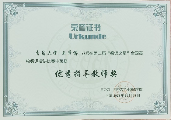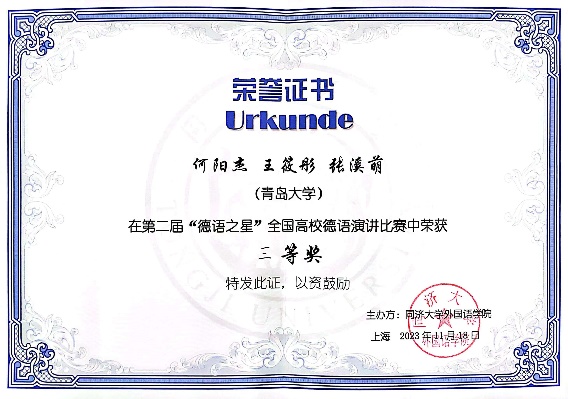 德语系为契合国家对外话语体系构建战略,培养学生用外语讲好中国故事能力,修订人才培养方案,创新课程体系,采取了一系列教育教学改革措施,成功获批国家新文科研究与改革实践项目“德语专业人才创新能力培养模式探索”、教育部外指委德语教学指导分委员会教育教学研究重点项目“中国德语学生话语能力建设研究”、山东省教改研究重点项目“新文科背景下德语专业国际化人才话语能力培养模式研究与实践”等教学改革研究项目,教学成果“本土化理念国际化实践——小语种专业一体两翼三支柱建设模式探索”获山东省第九届教学成果奖二等奖,开设“跨文化口译”“跨文化笔译”“演讲与辩论”“中国新思想德译本选读”等特色课程,着力培养具有家国情怀、国际视野和批判思维的新型外语人才,坚持以赛促学、以赛促教,积极鼓励并指导学生参加各类高端赛事,频频斩获佳绩,展示了德语系作为首批国家级一流本科专业建设点在外语人才培养方面所取得的成绩。期待更多的德语系学子在各类赛事中脱颖而出,为国家对外话语体系构建贡献力量。