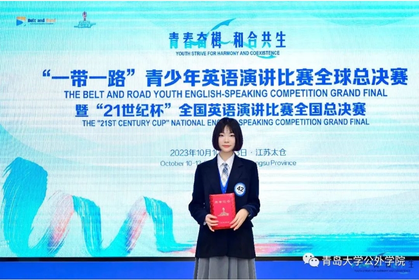 、公共外语教育学院高度重视,精心组织。王筱彤同学表现突出,通过校级、省级层层选拔,顺利晋级,代表山东省参加全国总决赛,凭借扎实的英语功底、强大的思维能力、稳定的临场发挥,从来自全国各高校的88位选手中脱颖而出。