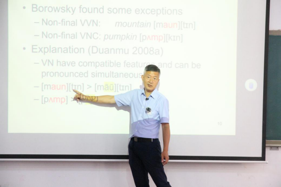 Bruce Hayes教授的讲座是“加泰罗尼亚语辅音交替音变的WUG测试研究”,对优选论中每个制约条件赋予特定的权重,观点新颖,方法独特,体现了当下语音学和音系学的方法趋向。