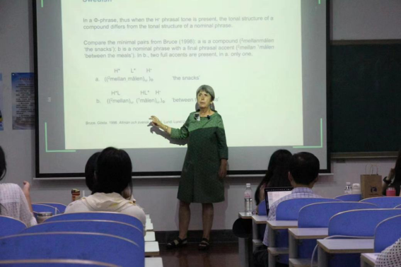 Caroline Féry教授的第一场讲座为“语调语言的语调系统类型”,介绍了语调的语法功能和非语法功能,通过比较德语和法语等典型语调语言在信息结构表达上的差异,介绍了“重调语言”这一新的语调语言类型。接着,Féry教授在“音高重调语言的语调研究”的讲座中,以瑞典语和日语为例重点分析了重调语言,探讨了重调语言与声调语言的异同。此外,Féry教授在“声调语言的语调类型”的讲座中介绍了声调语言的语调体系,指出声调语言作为一种以音高变化来表达词汇意义的语言,其语调体系表现出独特的特征。