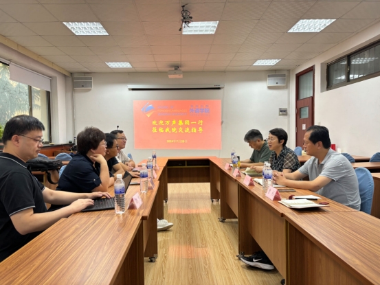 7个语种的人才培养特色,建议通过设立实习实训基地、企业家进校园、横向科研服务等形式开展产学研合作,解决集团对拓展出海业务、提升整体语言服务能力的需求。学院党委书记陈崇研强调,切实开展院企合作,帮助企业布点布局,既能解决企业人才队伍建设问题,又有利于拓宽人才培养路径,实现产教融合的双赢局面。副院长娄永强表示,双方应进一步增进了解,通过设立校企合作中心、“订单式”实习实践等形式开展合作,有利于学院更加贴近国家战略和社会需求,不断提升人才培养质量。