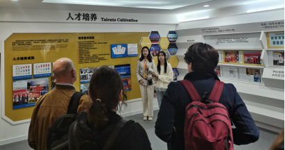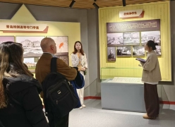 校史馆,德语系2023级三位专硕研究生同学綦钰、方铃琳和陈月娟为研学团提供德语讲解。研学团依次参观馆内各个展区,初步了解了A片无码