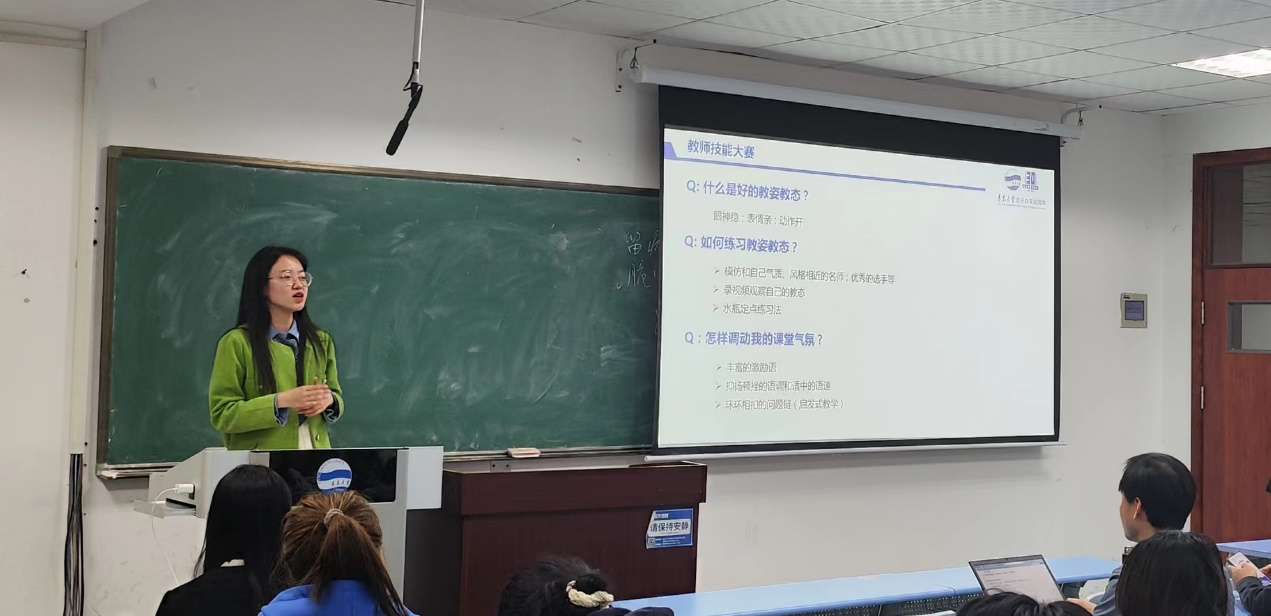 张文馨从教态与课堂掌控两方面进行交流,她认为专业基础的掌握尤为重要,例如专业必修课的教学法相关知识、信息技术的利用以及语音基础等;她还建议在准备大赛的过程中将题库中的外研版教材与人教版教材相比对,以便更好地掌握课文的主题与内涵。