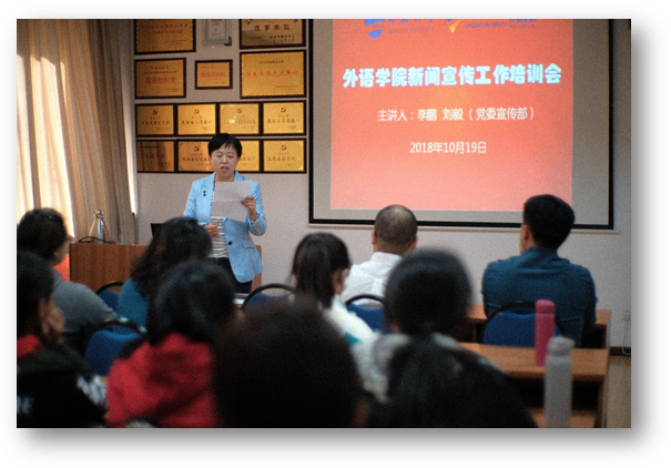 10月19日下午,学院在博文楼312会议室组织召开新闻宣传工作培训会,邀请校党委宣传部李鹏、刘毅两位老师就新闻宣传和新媒体运营等工作进行专题培训。党委副书记牟晓燕主持,学院各系(办)信息联络员、全体辅导员、学生会各部负责同学和外事帮志愿团共50余人参加培训。