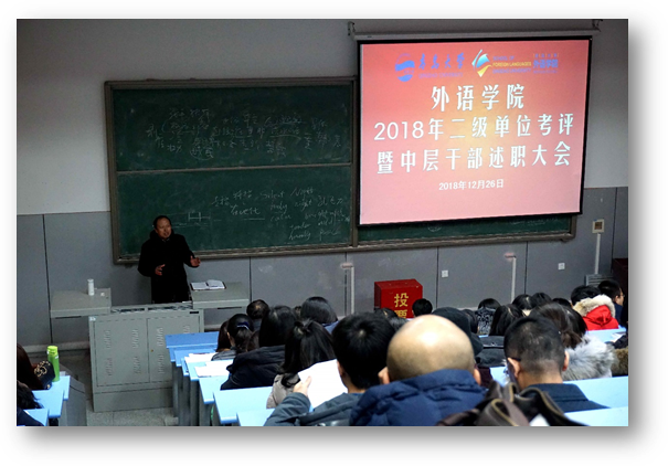 二级单位考评结束后,学院党政班子还就各自主管、分管和教学科研工作进行了公开述职。全体教职工对学院和党政领导班子工作开展情况进行了考评和投票。
