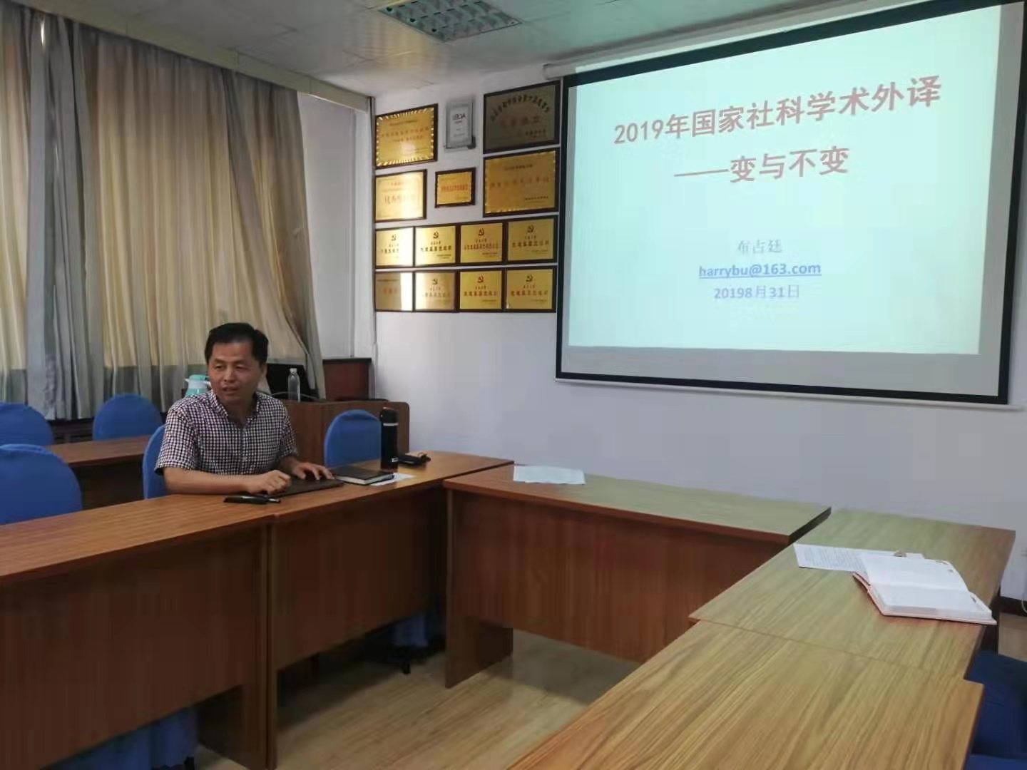 首先,布占廷副院长做了“国家社科学术外译项目:变与不变”的专题发言,主要分为两个部分。第一个部分他对2019年申报公告进行了详细解读,并与2018年申报政策进行了对比分析,指出今年申报政策迎来几个大的变化:(1)项目宗旨总基调不变,但强调了国家社科示范引领作用;(2)资助范围方面,拓宽覆盖年代,增列名家经典;(3)申请形式方面,学术著作全部实行出版社+个人的联合申报模式,并细分了不同立项文版语言,有利于真正调动高校教师与科研人员申报的积极性;(4)项目类别与资助额度方面,划分重点项目与一般项目;(5)申请要求方面,针对英文版与非英文版提出不同资质要求,并要求联合至少一名外方译者/审校,以及学科专家学者,成立团队,联合翻译。在第二个部分,布占廷副院长简要回顾了外译项目过去九年项目的立项情况,并总结规律,指出项目申报努力的方向。
